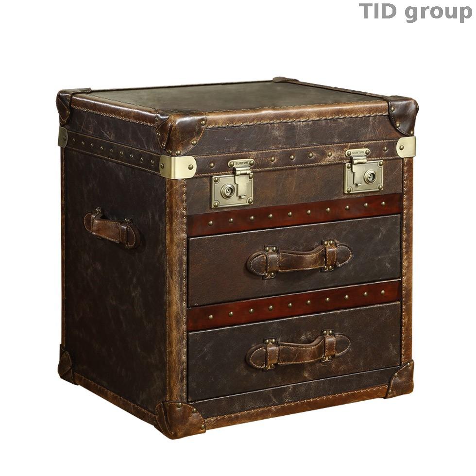 Декоративный столик из винтажной кожи, два выдвижных ящика, кожаные уголки, кожаные ручки, деревянные рейки из состаренного дерева и декоративные гвозди из литого металла.